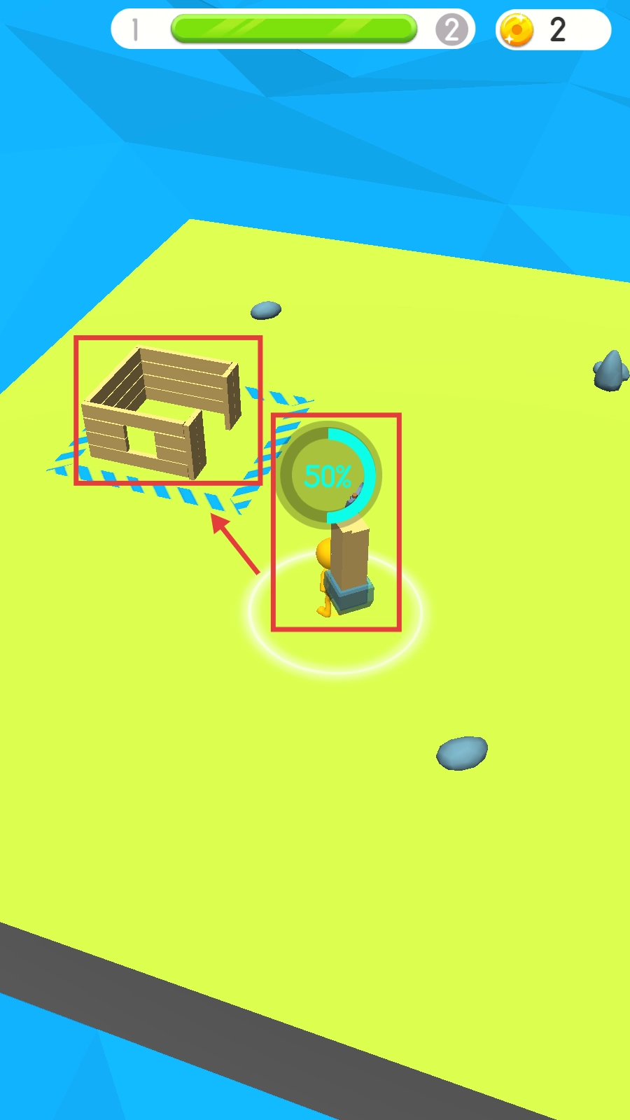 收集齐木材后,来到搭建区域附近,稍作等待即可完成建造,以此逐步推进建造任务,进而拓展领地范围。