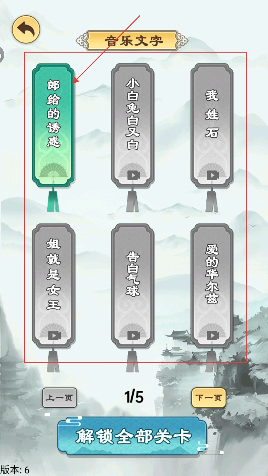 打开游戏后,进入【音乐文字】界面,选择【郎给的诱惑】这首歌曲,然后进入歌词拼接关卡。