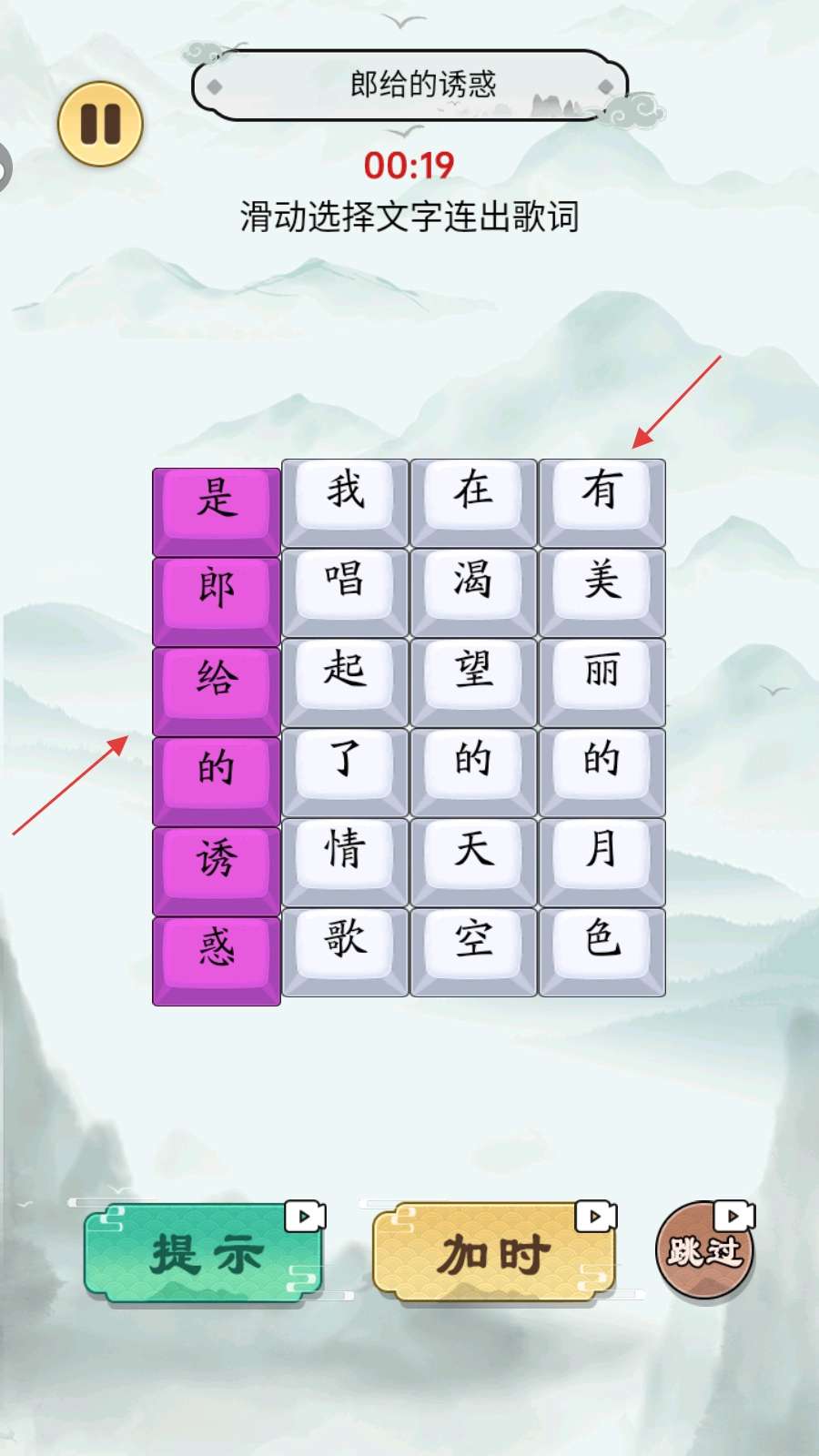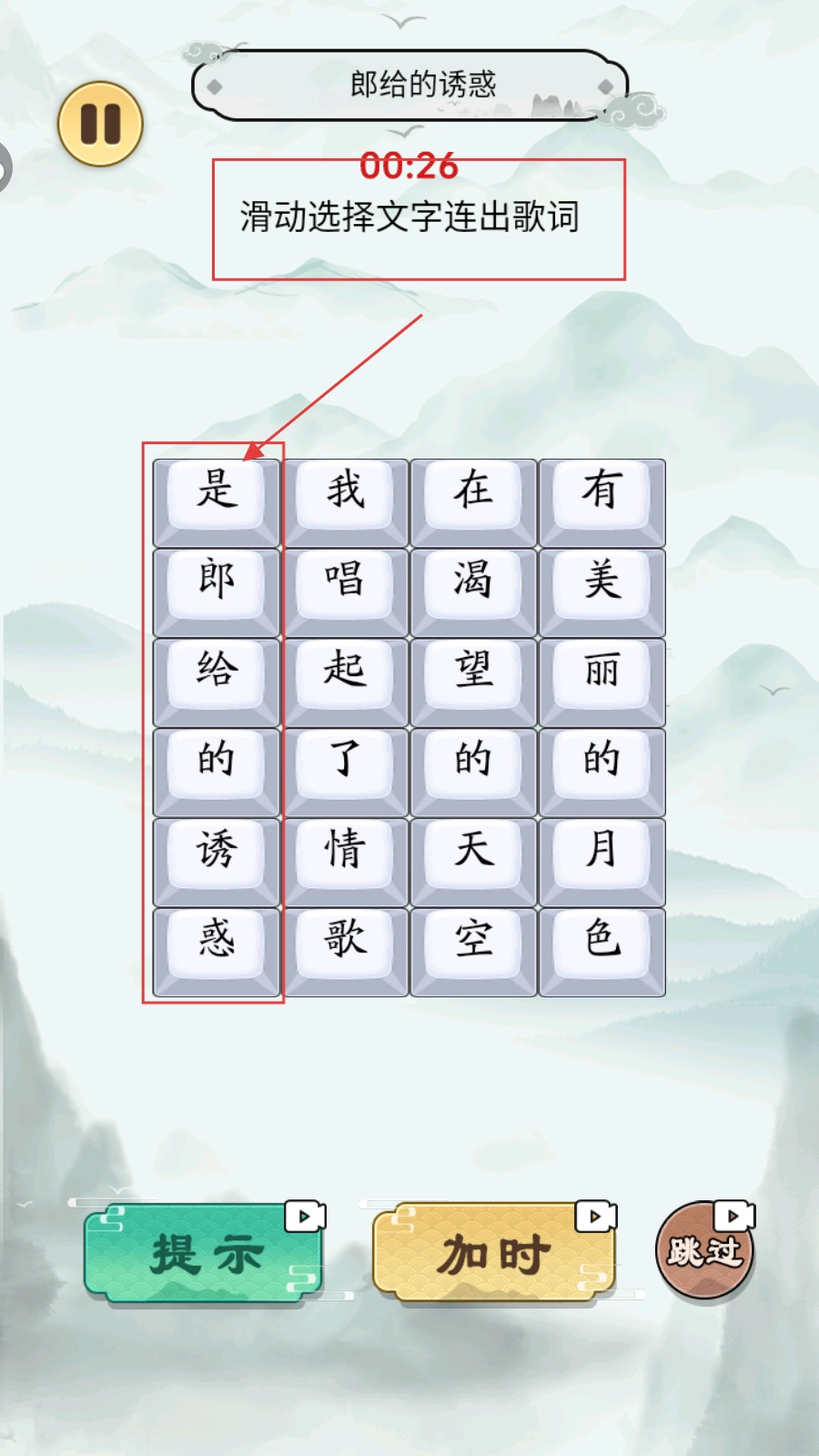 按照“滑动选择文字连出歌词”的规则,找出与“是郎给的诱惑”相对应的文字块。