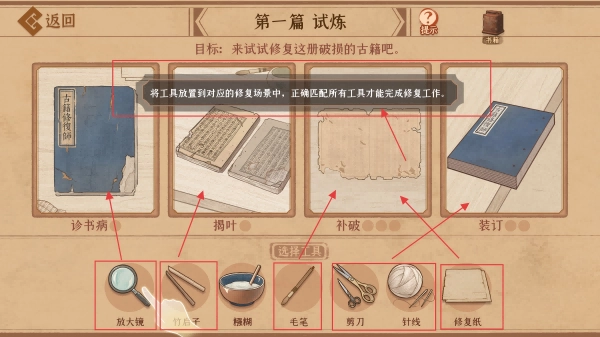 工具系统十分丰富:要解锁竹启子、糨糊、针线等各类专业修复工具,每一种工具都对应着特定的修复环节,借助对工具的合理运用来掌握修复的技巧。