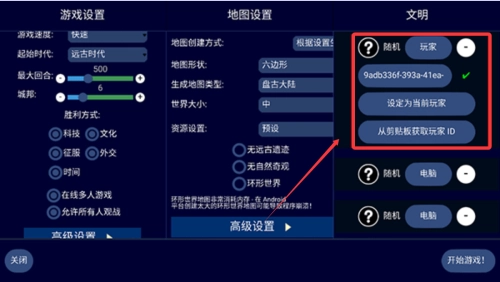 请每个参与游戏的玩家,把自己的玩家ID填写到想扮演的文明对应的“ID”文本框中。若想快速填入自己的ID,直接点击“设置为当前玩家”按钮即可自动完成填写。