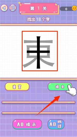 找出能够拆分的18个汉字,每找到一个就可以点击下方的提交按钮。