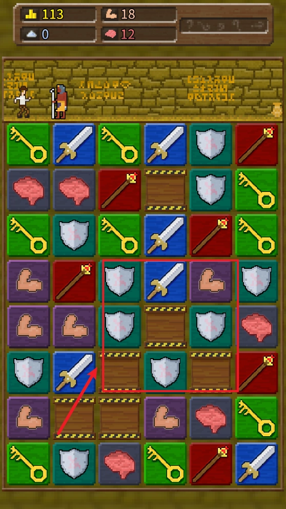 开始时先熟悉三消的规则,剑形图标用来攻击怪物,法杖用于释放魔法,钥匙则能开启宝箱。消除时优先处理同色方块,这样可以触发连击效果,带来更高的伤害。