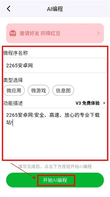 3. 依次填写微程序名称、挑选类型、选定编程模型,填写完功能描述后,点击“开始AI编程”