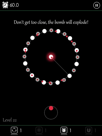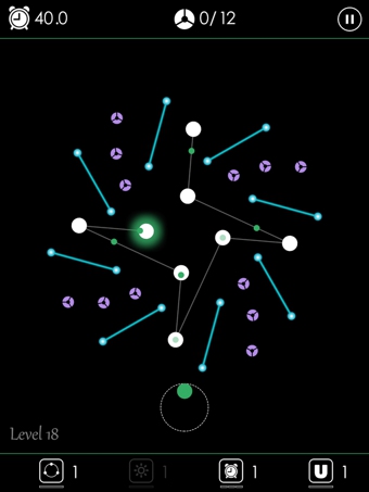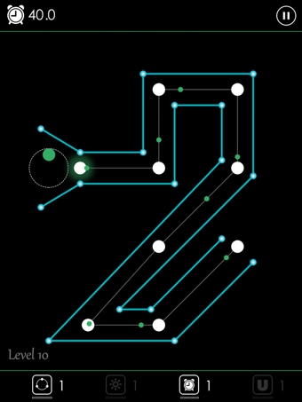 关卡往下难度开始慢慢增加,开始了真正意义上的闯关,在一个个白色圆点之间,加入了很多间隔的蓝色光线,这些激光线会瞬间秒掉小绿球,所以必须小心意义的避开,以此为基础就出现了各种被激光“重重包围”的关卡,想要一次安全过关的话,玩家就必须保证心如止水,手如磐石,找准角度,谨慎前进。