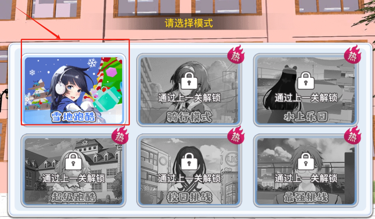 在模式选择界面,挑选带红框的雪地跑酷模式,亦或是其他尚未解锁的模式。