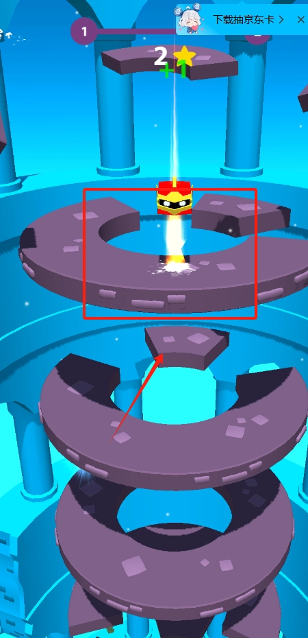 你会看到紫色环形平台的中央站着一个戴头盔的角色,长按屏幕进行蓄力,就能让角色向上喷射,飞到更高的平台上获取分数。