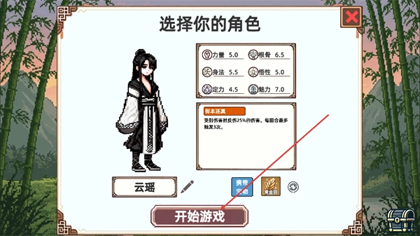 在角色选择界面,选定云瑶这个角色后,确认她的属性以及御本还真技能,点击开始游戏就能进入游玩环节。