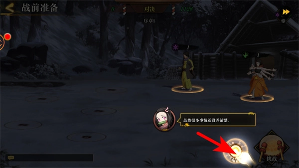 请跟随红色箭头的指引,点击演练按钮进入战前准备环节,完成战斗前的对话交互,以推进关卡流程。