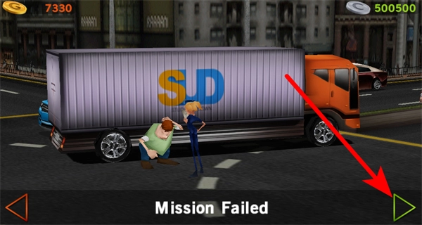 要是看到“Mission Failed”任务失败的提示,就点击界面右下角的绿色箭头,重新启动驾驶挑战,这样就能再次尝试完成这一局了。