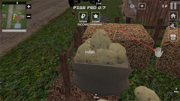 当前的任务是给7头猪喂食,需要点击右侧手掌拾取界面里的Potato当作饲料,这是完成喂食任务必须要做的步骤。