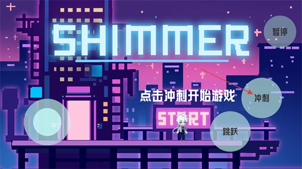 这是Shimmer的启动界面,点击冲刺按钮即可开启游戏;右侧的按键为核心操作键,能助力后续游玩。