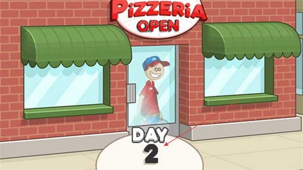 界面上呈现着披萨店的开业标识,目前已进入第二天的经营阶段,点击进入就能开启当日披萨店的营业以及餐食制作任务。