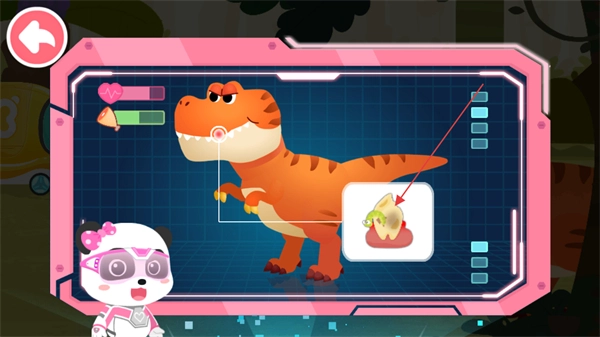 进入恐龙互动界面后,要依据提示挑选对应的物品,观察恐龙状态条的变化,再执行相关操作来推进流程。