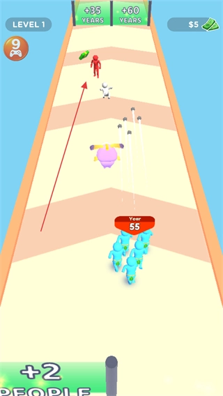 带领人群穿越数字方块区域,收集方块上的数值以提升人群属性。