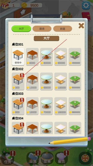 在设施的大厅界面里,能够消耗金币解锁桌位002这类桌位,通过这种方式来扩大店铺的接待能力。