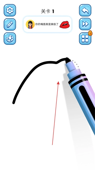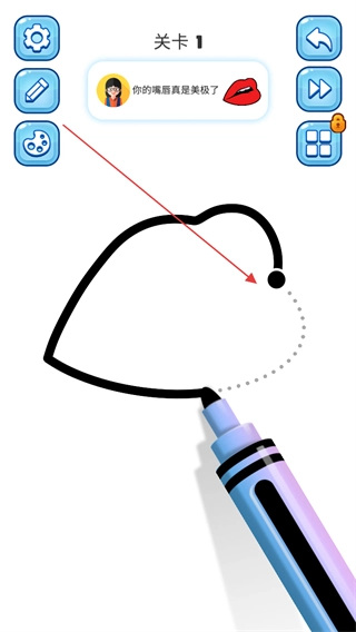 进入关卡1,使用画笔工具绘制嘴唇的轮廓线条。