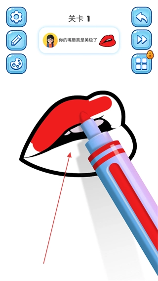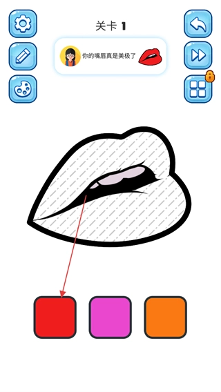 用画笔在嘴唇部位进行涂抹,把这片区域填成红色,就能让关卡进度往前推进。