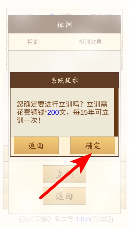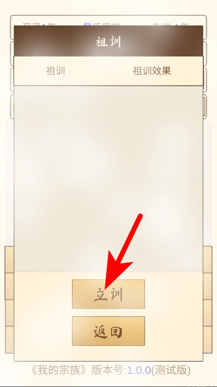在祖训页面,点击立训按钮,触发立训确认提示。