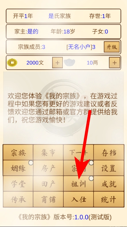 在游戏主界面,点击祖训选项,进入祖训功能页面。