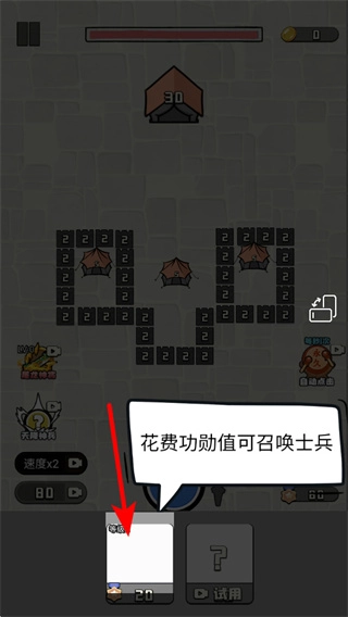 在游戏界面里,花费对应的功勋值来召唤士兵,依靠士兵的战斗能力加入战斗,推动关卡里对敌方单位的清理进程。