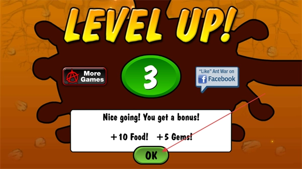 升级完成后会弹出奖励界面,点击OK按钮即可领取10份食物和5颗宝石的奖励。