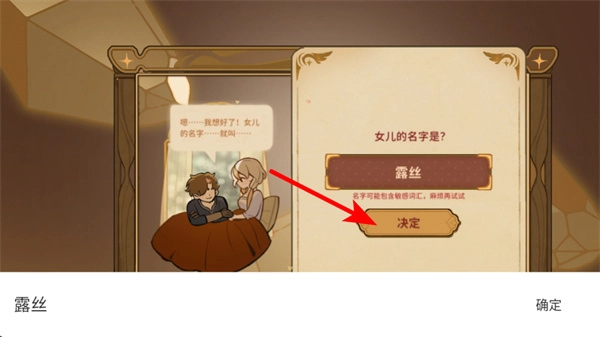 进入角色创建阶段后,给女儿选定名字(比如默认的露丝),点击决定按钮完成命名,就能正式开启游戏剧情与养成环节了。