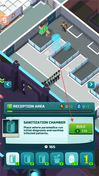 在界面里找到SANITIZATIONCHAMBER,点击BUILD按钮,消耗110资源来建造这个设施。