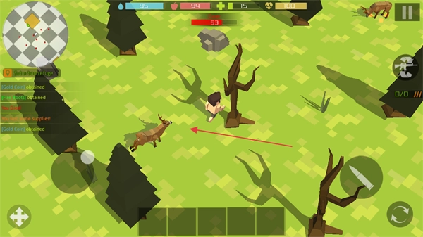 靠近野外生物如鹿,准备发起攻击获取物资。