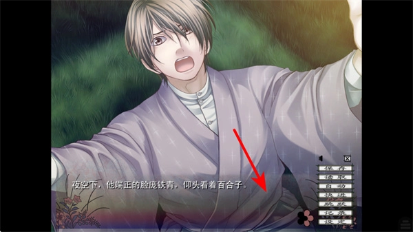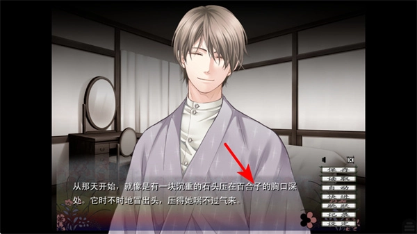 在剧情界面里,你可以阅读当前的文本描述,比如“沉重的石头压在百合子胸口”这样的内容,与此同时,还能借助右侧的选项栏进行互动,以此来推动剧情的发展。