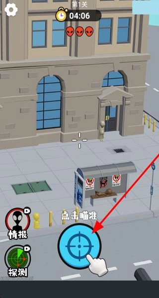 找到目标后点击瞄准按钮,进入瞄准状态,为射击做好准备,提升击中目标的精准度。