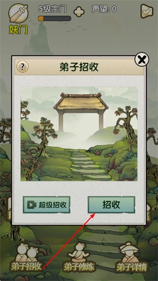点击“弟子招收”选项,通过选择普通招收或超级招收的方式获取弟子,以此为宗门吸纳更多成员。