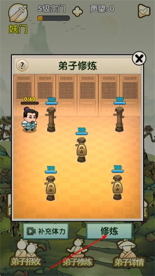 进入弟子修炼界面后,可安排弟子于修炼木桩处进行修炼,以此提升弟子的实力。