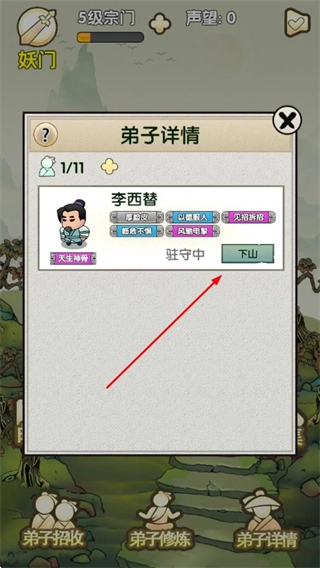 在弟子详情界面查看弟子状态,点击下山派遣弟子外出历练,以此提升宗门等级。