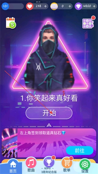 打开游戏界面后,在主页上能看到当前的生命值数量,点击“开始”按钮即可快速进入第一关的挑战。
