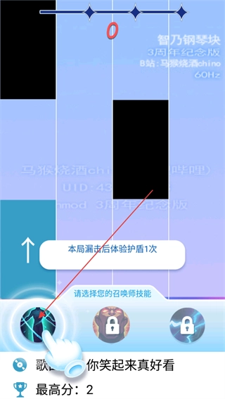 在关卡中,你可以选择界面下方的技能来助力自己更顺利地完成关卡挑战。完成关卡歌曲的方式是点击黑色方块以获取积分。