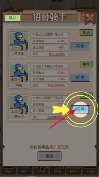 在骑手招募界面,点击同意按钮,就能录用像杨修这类拥有创造成益与送达速度加成能力的骑手,从而提高配送效率。