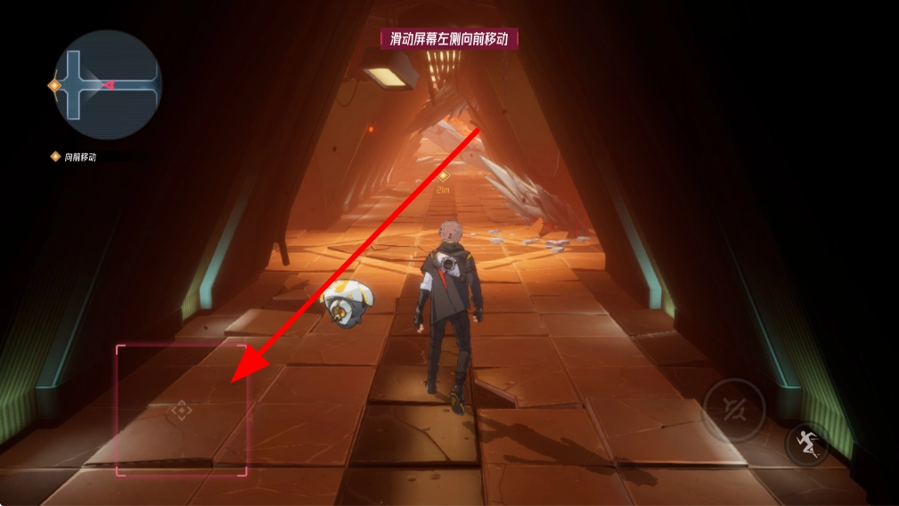 首先在屏幕左侧进行滑动操作,以此操控角色向前移动,在场景里展开探索,朝着目标所在的方向行进,为之后遇到怪物并展开战斗做好准备。