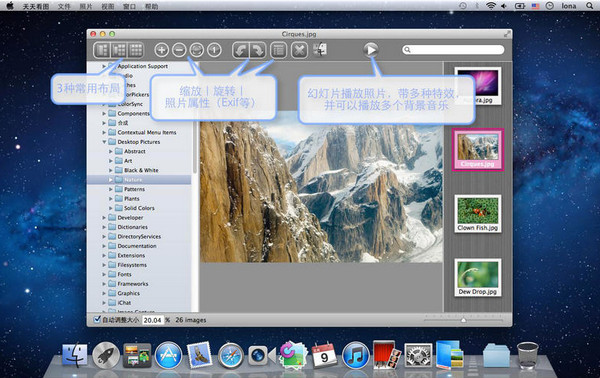 天天看图 mac版是一款多功能图片阅览工具。软件支持图片全屏预览,支持幻灯片效果,支持多种特效等等。是ios系统中比较好用的一款图片浏览器。