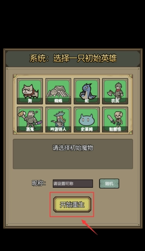 选择红框初始英雄狼人,点击开始重生按钮。