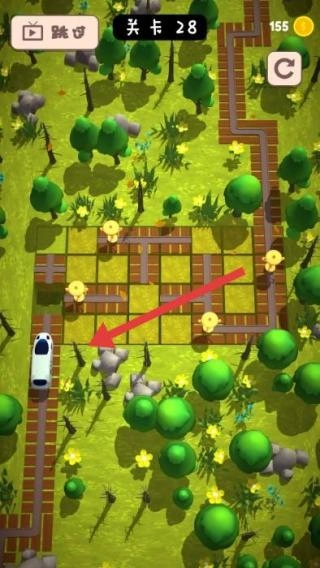 关卡28/3/41,滑动白色汽车,沿网格道路行驶,避开树木和石头,接上黄色乘客。