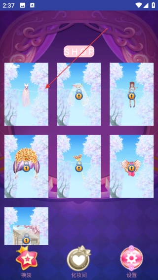 点击城堡里的“开始”按钮,就能进入换装场景,接着挑选右侧的服饰(比如连衣裙),来给角色进行搭配。