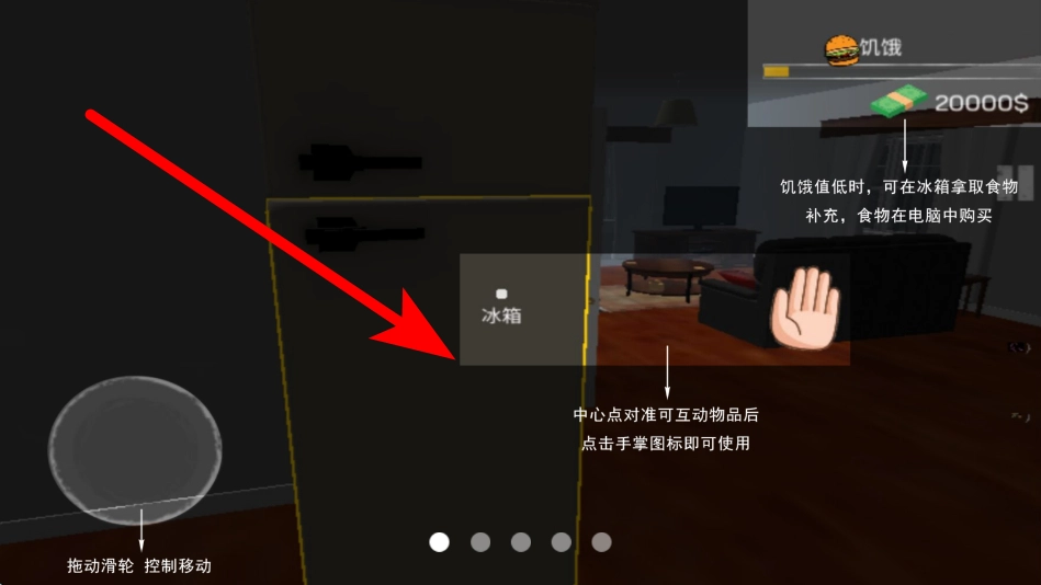 当饥饿值偏低时,你可以找到冰箱,把中心点对准冰箱这个能互动的物品,从冰箱里拿取食物来补充饥饿感,而食物可以在电脑上进行购买。