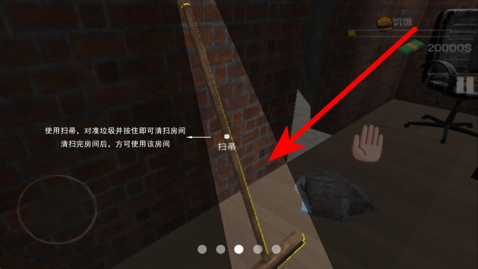 接下来进行房间清扫工作,先拿起扫帚,把扫帚的中心点对准垃圾所在位置,随后按住扫帚进行操作,这样就能完成房间清扫;只有等清扫工作全部结束后,这个房间才可以投入使用。