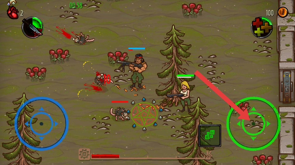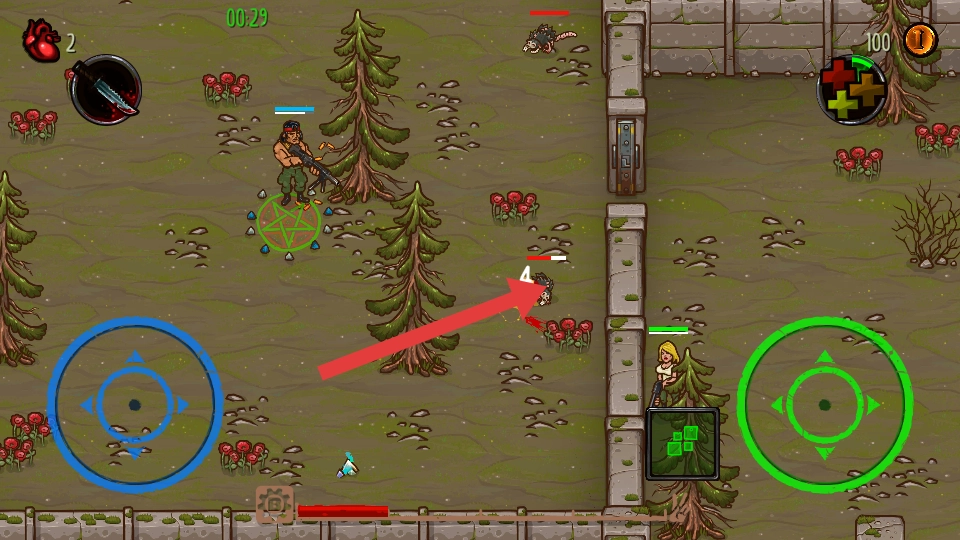 战斗时要紧盯着显示生命值的血条,一旦血量偏低就躲到石墙后面寻求掩护,反击的时候得抓住怪物攻击的间隙,还要记得拾取掉落的金币。