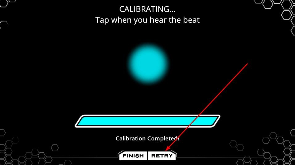 在进行校准的界面里,当听到节拍声时,点击屏幕就能完成校准流程;校准结束后,你可以选择“FINISH”选项来结束操作,也可以选择“RETRY”选项重新进行校准。