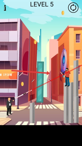 留意敌人所处方位,以及场景里像金币、建筑这类障碍物,提前推测子弹的弹射轨迹,点击屏幕完成发射,借助反弹效果击中藏在金币后面的敌人。