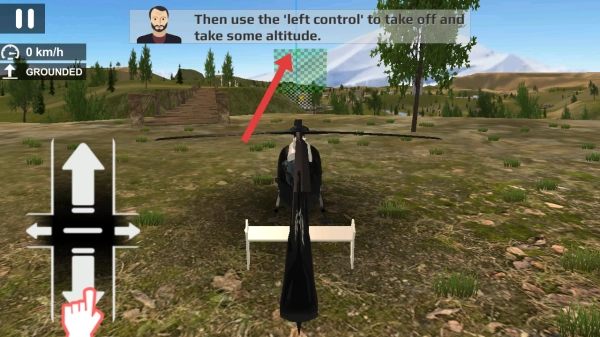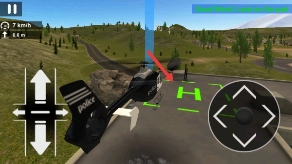 按照系统提示操作,利用左侧的方向控制按键,向上推动可使直升机起飞,随后朝着画面上方带有绿色方格标记的区域逐步提升高度。