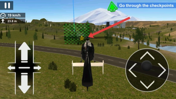 驾驶直升机前往绿色检查点,途中要拾取检查点中央的黄色星星,同时调整飞行的方向与高度,以顺利通过检查点。