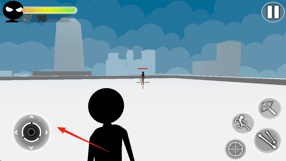 在选关界面点击LEVEL1对应的第一关,进入游戏后,通过操控左侧的摇杆来移动火柴人,使其逐步靠近远处的敌人。